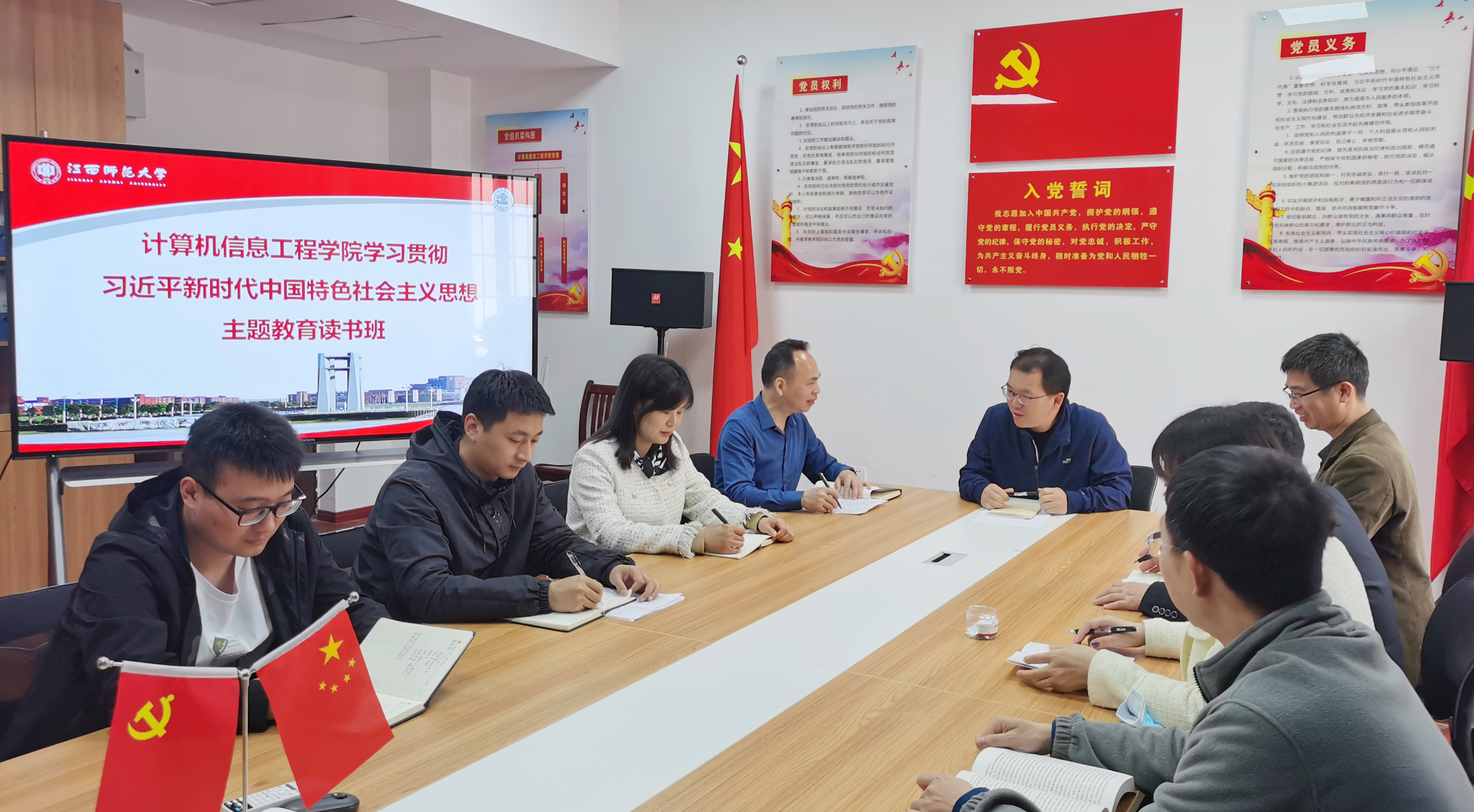 4月26日下午,计算机信息工程学院党委学习贯彻习近平新时代中国特色社会主义思想主题教育读书班第二次集中学习研讨在学院党员活动室举行。主持学院行政工作的副院长江爱文作专题辅导报告;学院领导班子成员、党委委员、各支部书记听取报告,并参加讨论学习。